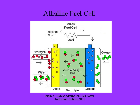 - Alkali fuel cells operate on compressed hydrogen and oxygen. They generally use a solution of potassium hydroxide (chemically, KOH) in water as their electrolyte. Efficiency is about 70 percent, and operating temperature is 150 to 200 degrees C, (about 300 to 400 degrees F). Cell output ranges from 300 watts (W) to 5 kilowatts (kW). Alkali cells were used in Apollo spacecraft to provide both electricity and drinking water. They require pure hydrogen fuel, however, and their platinum electrode catalysts are expensive. And like any container filled with liquid, they can leak.