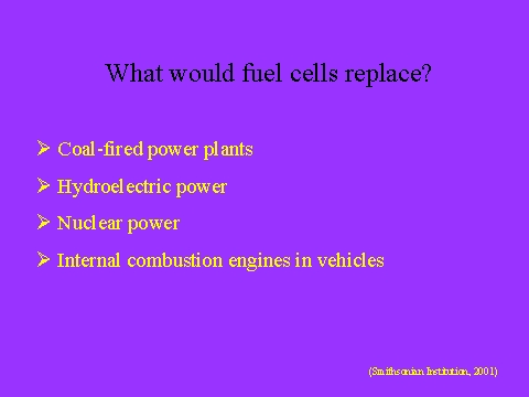 - Power plants: Southern Cali Gas Co. has 10 fuel-cell plants on-line in Caifornia. They provide energy to a hotel in Irvine, Hospitals in Anaheim and Riverside, and even the Santa Barbara county jail. California’s Pacific Gas & Electric Co. is gearing up for a 125 KW system. Fuel cell test are underway in Buffalo, Pittsburgh, and Atlanta. Japan has an 11-megawatt plant operating on Tokyo Bay.