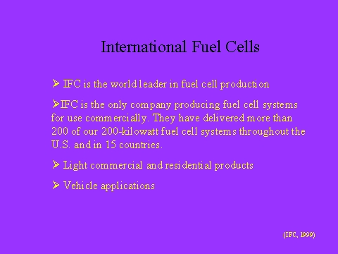 Well over half of all U.S. air pollution is generated by "mobile sources," principally cars. Attempts to clean up the internal combustion engine have proven futile in the face of ever-increasing auto use. This problem can be solved using IFC's fuel cells, making transportation applications among the most exciting uses for a fuel cell.