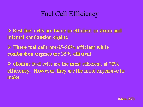 - These fuel cells are 65-80% efficient while combustion engines are 35% efficient