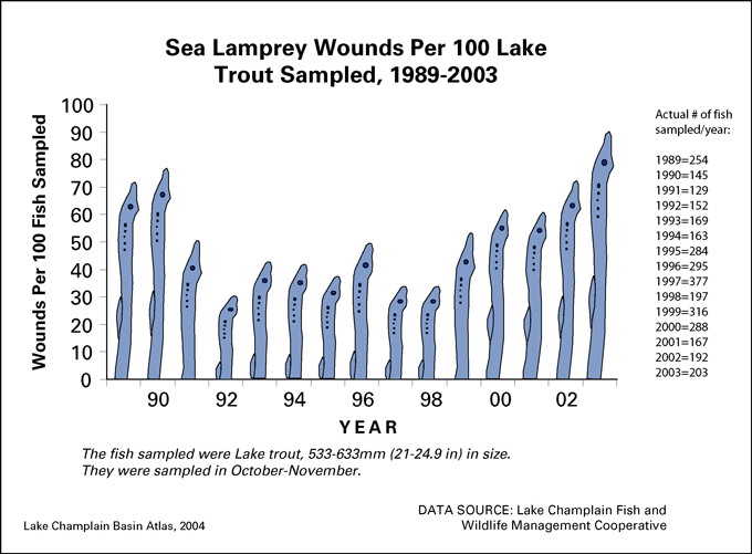 | In 2005 it was reported that sea lampreys were in fact native to Lake Champlain, however sea lamprey populations have been rising and causing a lot of problems for Lake Champlain. Since 1998 there has been a steady increase in fish wounding rates due to sea lampreys. (See Fig 6 ) |