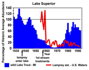 As seen in Fig 7, the introduction of sea lampreys was directly correlated with the drastic fall of wild Lake Trout populations in Lake Superior. When streams were treated for Lampreys, the wild Lake Trout populations were able to recover. The delay of recovery is a natural process that happens with population fall and rise. |
