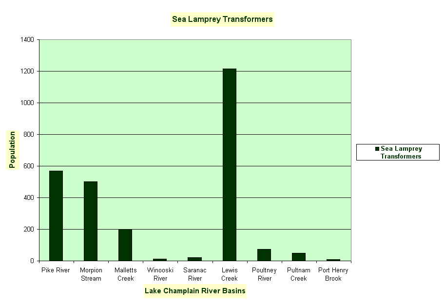 Marsden,Ellen J., Eric Howe, Patrick Sullivan, Mark Malchoff.2004. Great Lakes Fishery Commision. Project Completion Report. "Movement and Population Size of Sea Lamprey in Lake Champlain and its Tributaries. February 16, 2006.